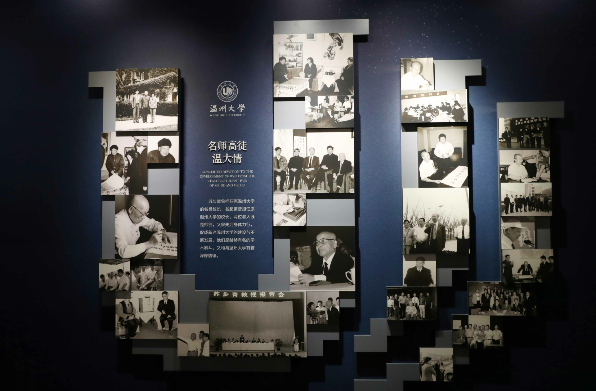 苏步青谷超豪纪念馆设在温州大学南校区岩松堂二楼,总面积364平方米,设置“序厅、苏步青专题、谷超豪专题、名师高徒温大情、尾厅”五个板块,采用历史图片、实物展出、仿真场景、影音视频、媒体互动等现代艺术手法,全方位展示苏步青、谷超豪两位先生的生平事迹和卓著成就。