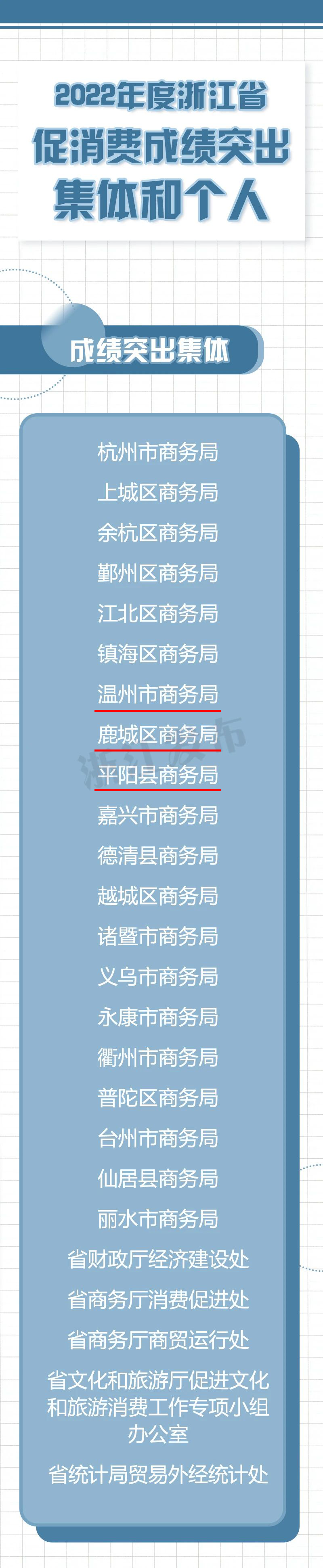 近日,浙江省政府办公厅印发《关于表扬2022年度促消费成绩突出集体和个人的通报》,决定对25个集体和50名个人予以通报表扬。其中,我市3个集体、4名个人在列。