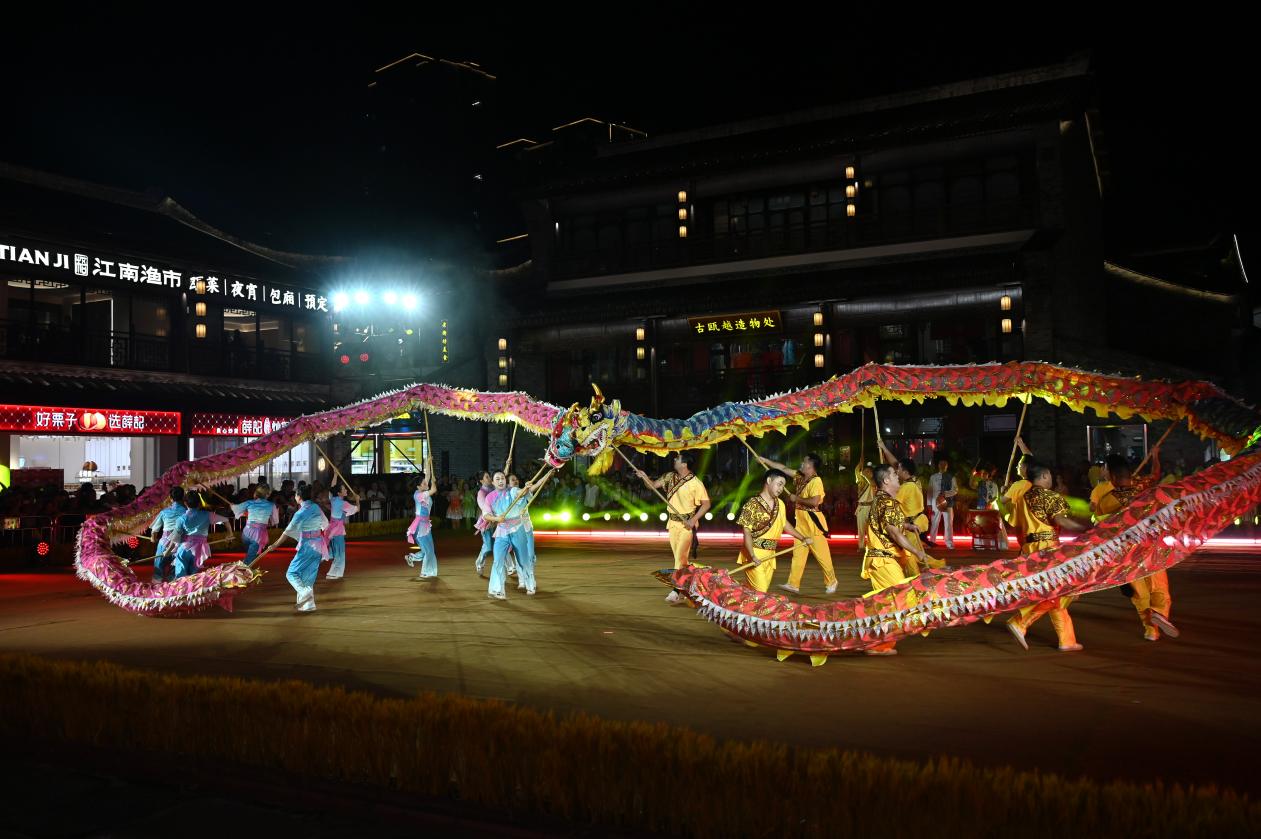 当晚的梧田老街,红灯笼映着古街黛瓦,早早聚集的市民与游客不时举起手机记录热闹场景。19时许,随着一阵欢快的乐曲声响起,《丰收歌》率先登场,活动正式拉开帷幕。紧随其后,《乐清湾鱼灯舞》表演者们手持色彩斑斓的鱼灯,灵动跳跃,仿佛将乐清湾的波光粼粼与渔家喜悦带到了现场。