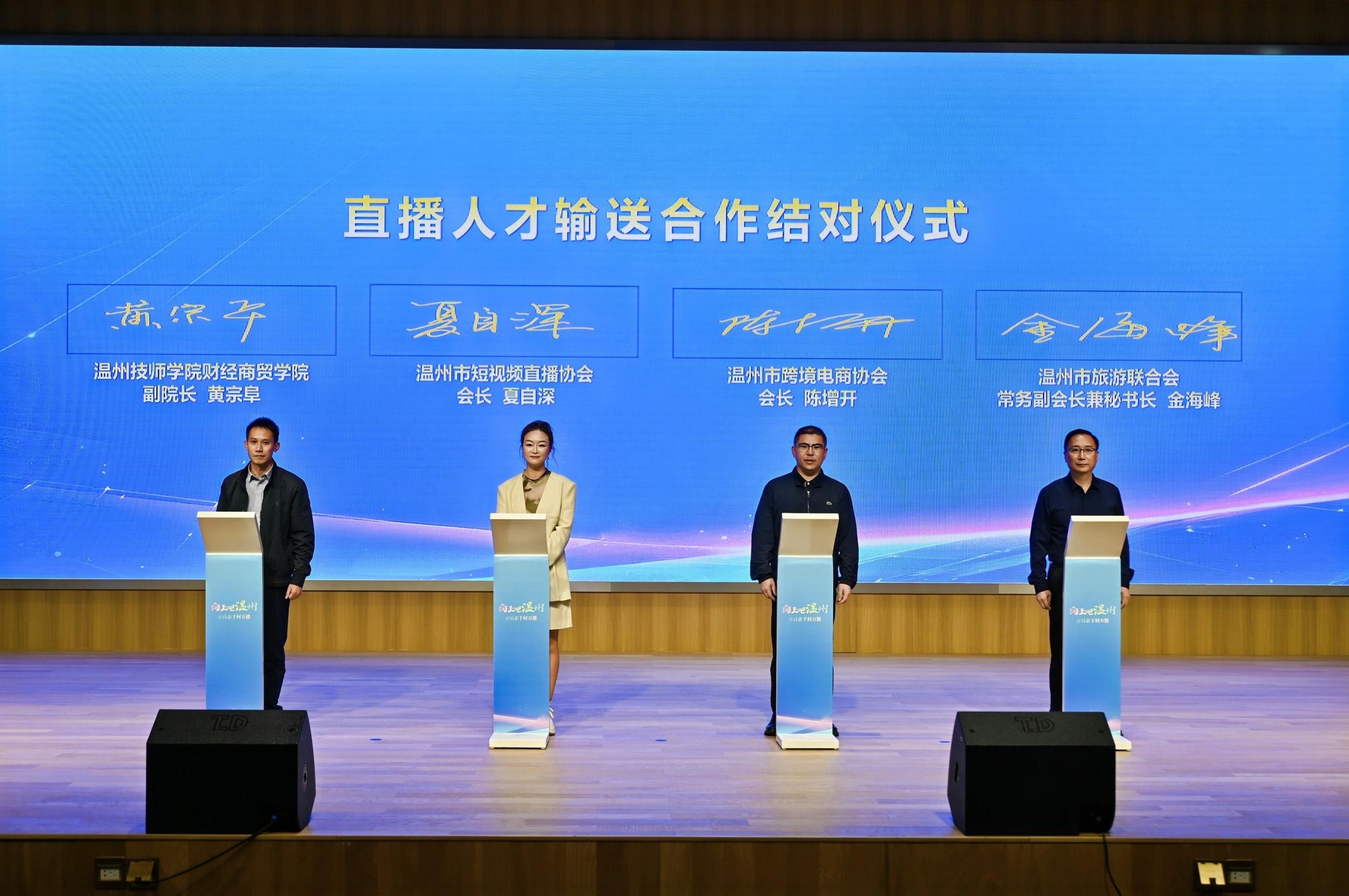 启动仪式上,三场产业合作签约格外引人注目。温州农企丰甘生态农业、泽雅镇龙头村与农播联盟签署《农产品产销播一体化合作备忘录》,通过“企业供源、乡村出特产、主播带货”的协同模式,为农产品拓宽销售渠道,打通从田间到消费者的数字链路;中国 (瓯海) 眼镜小镇与阿坝州互联网协会达成合作共识,借助直播电商优势,让温州制造的眼镜产品直抵西部消费市场,实现跨区域产业联动;温州技师学院与温州市短视频直播协会、温州市跨境电子商务协会、温州市旅游联合会签署《直播人才输送合作备忘录》,搭建“培育—吸纳”一体化人才通道,实现网络主播人才培养与产业需求无缝对接。同步启动的第二届“‘数’温州 正强城”网络主播大赛特别设置农产品、文旅美食、家居百货、服饰鞋履、教玩具五个细分赛道,精准匹配温州农业特色与制造业优势,助力参赛主播提升“懂产品、善传播”的综合能力,推动数字人才与产业发展精准适配。